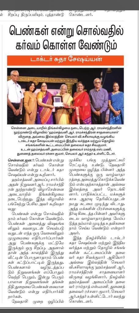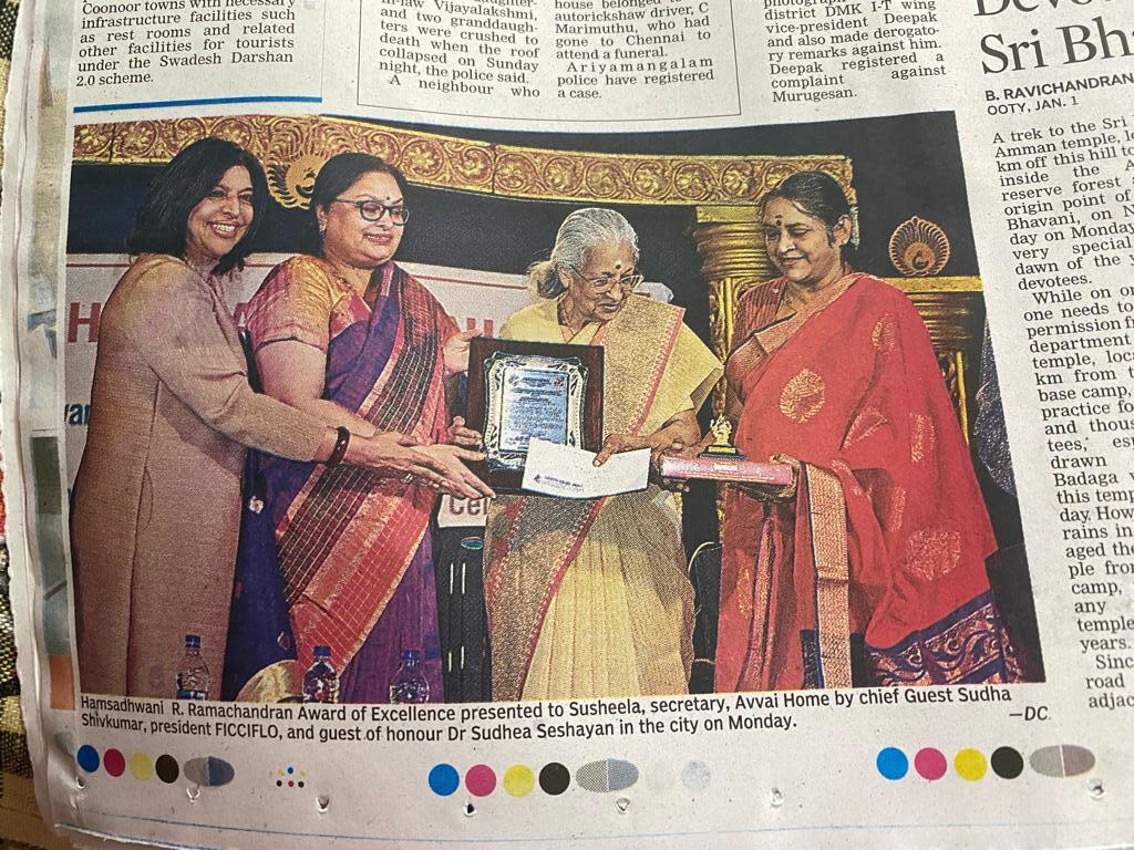Hamsadhwani R. Ramachandran Award of Excellence Presented to Susheela, Sectretary, Avvai Home by chief Guest Sudha Shivkumar, President FICCIFLO, and guest of honour Dr Sudhea Seshayan in the city on Monday.